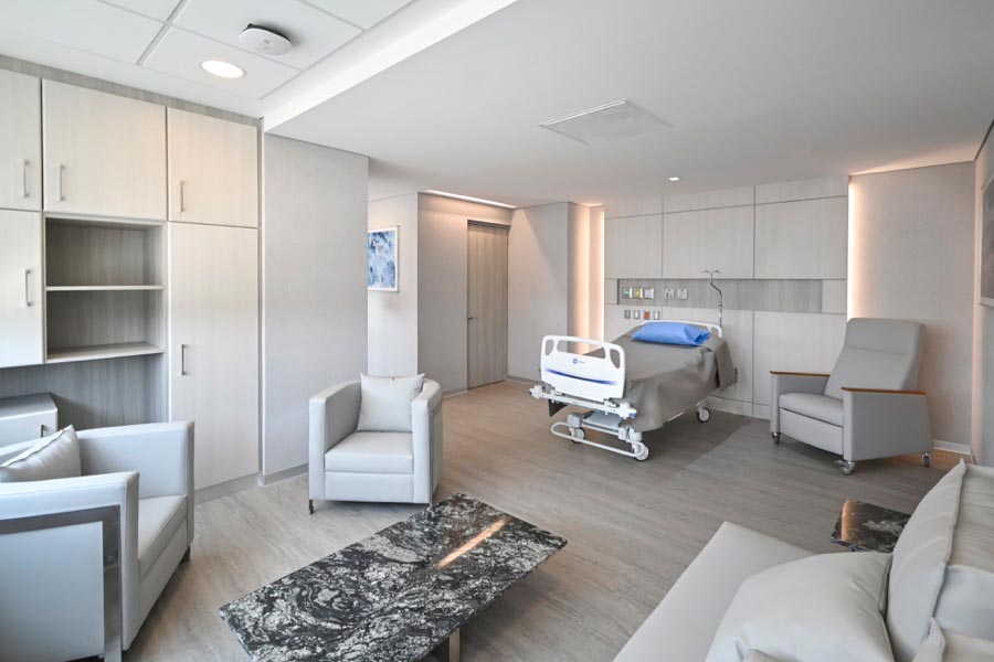 [alt] => Suite hospitalaria con cuatro sillones en color gris, paredes con tapiz beige y luces led, con cama hospitalaria de fondo gris y cojin azul.