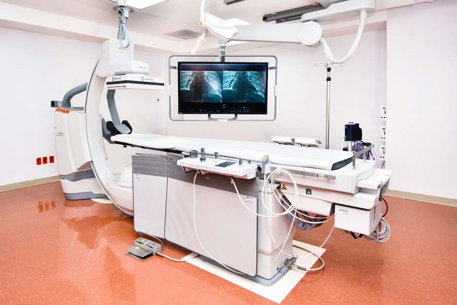[alt] => Equipo de hemodinamia blanco con gris,dentro de cuarto blanco con piso naranja y pantalla táctil a un costado proyectando un vascular.