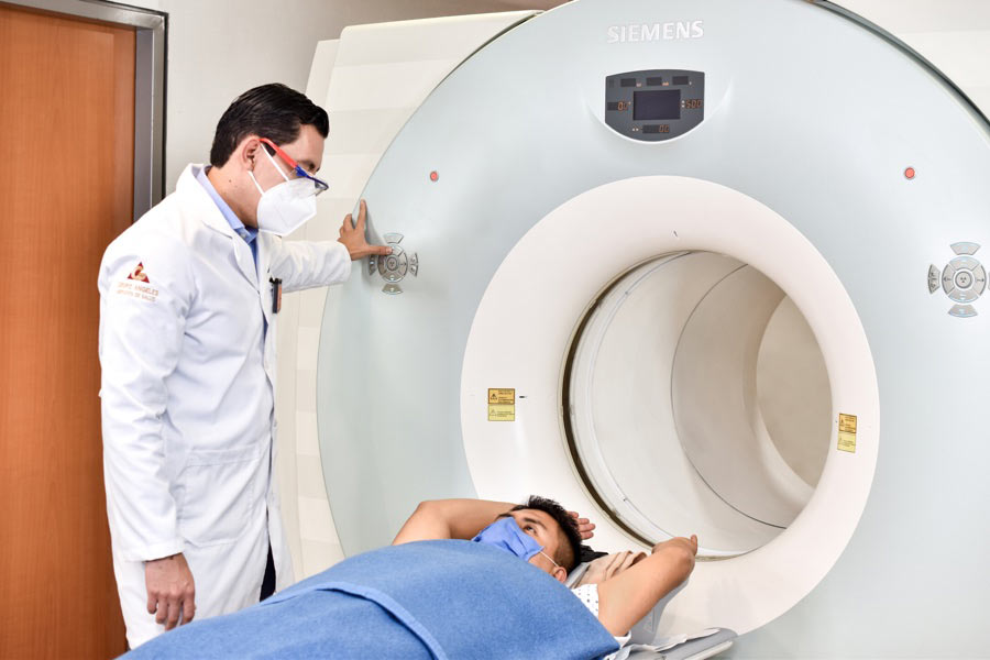 [alt] => Paciente recostado sobre la camilla del tomógrafo blanco con gris y doctor presionando un botón para ingresarlo dentro del equipo.
