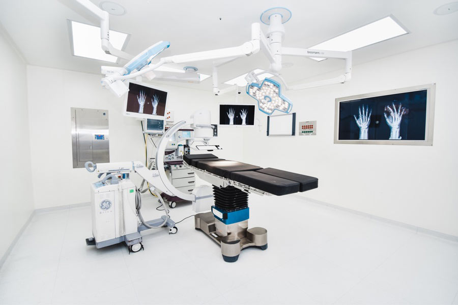 [alt] => Quirófano blanco con piso gris, mesa quirúrgica negra y pantallas 4k proyectando unas radiografías de manos. Atrás maquina de anestesia color blanco.